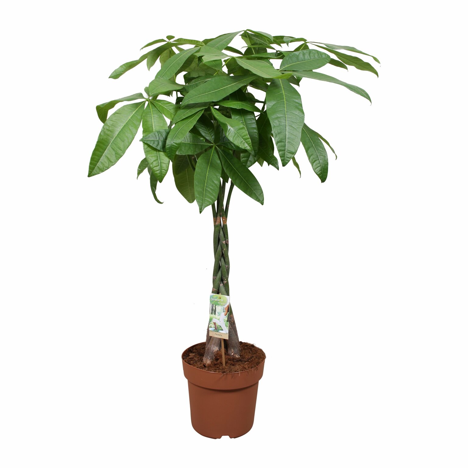 Pachira Aquatica, Watercacao of Geldboom heeft een gevlochten stam. In het Verre Oosten bestaat de overtuiging dat de bladeren van deze kamerplant geld kunnen vangen, vandaar de bijnaam: Money Tree. Een ideaal cadeau voor house warmings en verjaardagen. De Pachira kom oorspronkelijk uit de moerassen in Midden- en Zuid-Amerika.